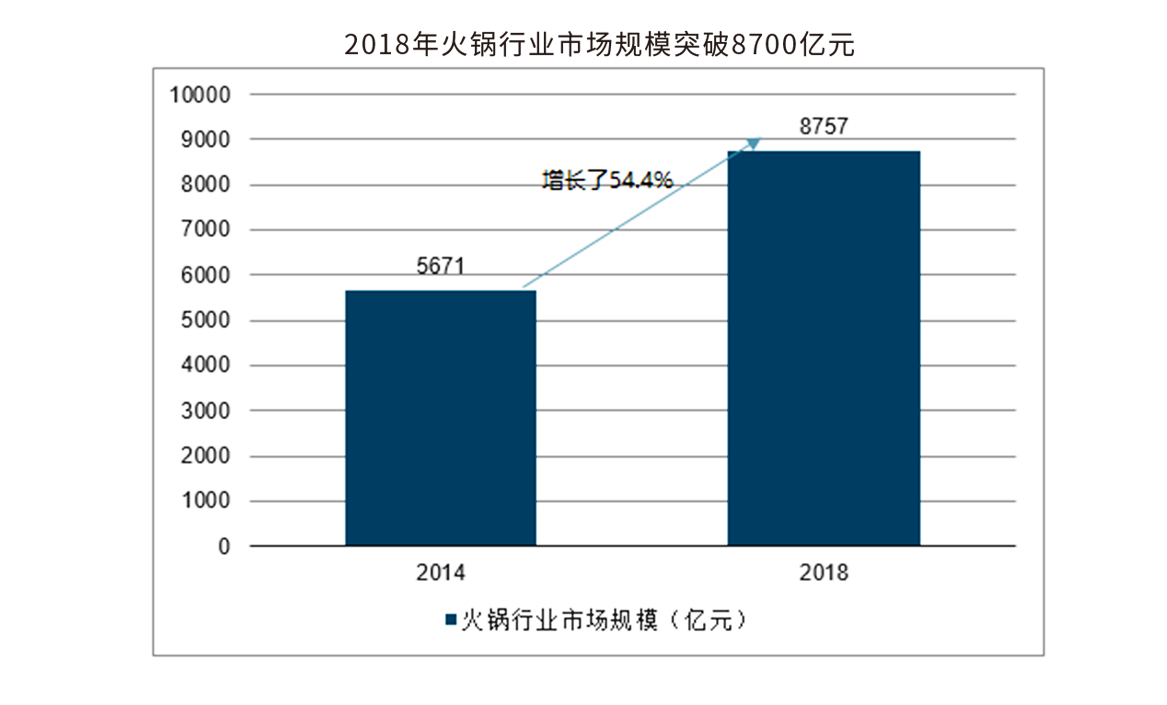众所周知,火锅餐饮是餐饮细分中最大的品类,是餐饮行业的翘楚,2018年,全国火锅业实现总收入8757亿元,占餐饮市场份额的比重达到20.5%,而且火锅餐饮行业还在持续增高,未来几年火锅市场有望迎来万亿市场空间。